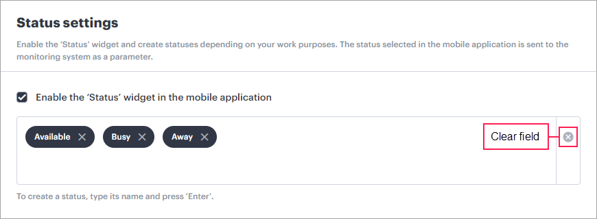 Activate the Enable the ‘Status’ widget in the mobile application option in order for the Status widget to be displayed in WiaTag. In the field below, add statuses which the WiaTag user can select. The ones added by default are Available, Busy, and Away. To create a new status, type its name and press Enter. To delete a status, click on the icon