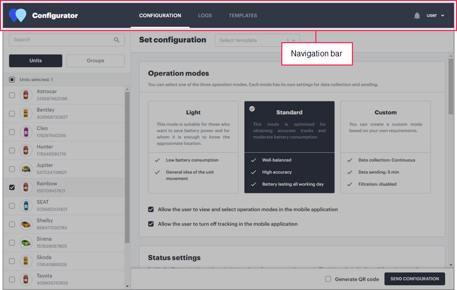 Using the navigation bar, you can go to different pages of the application, open the documentation, and log out.