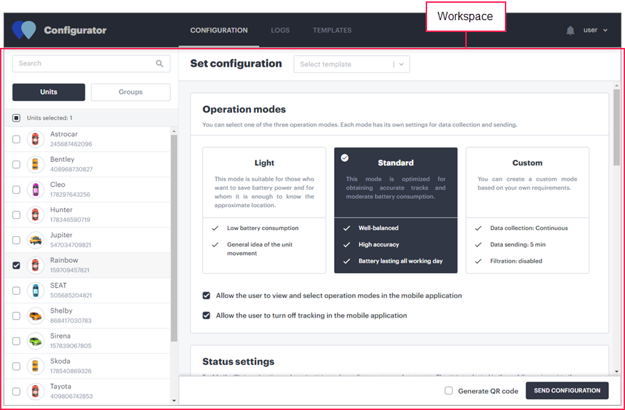 The workspace is the main part of the application window. Its content depends on the page selected in the navigation bar.