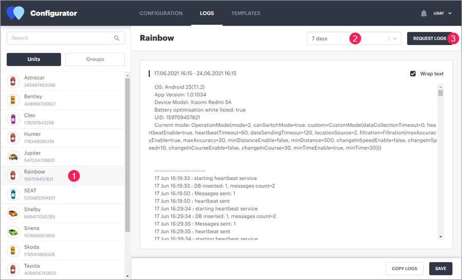 The requested logs are displayed on the page when the device is online. If the WiaTag user has sent the device logs to Configurator, they are shown immediately after selecting the unit.