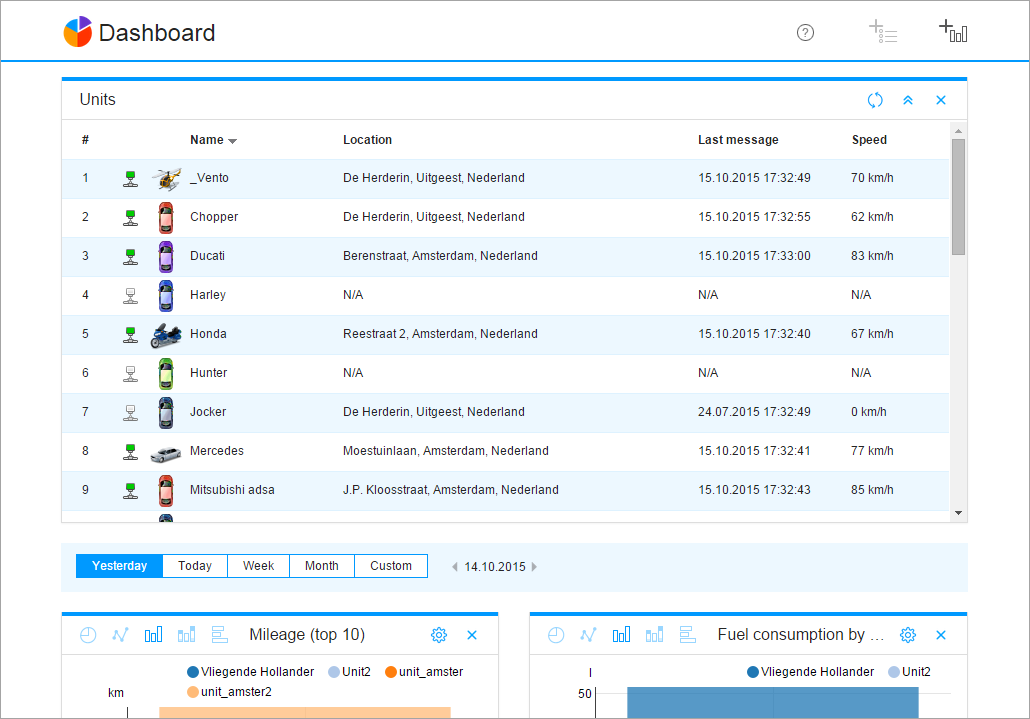 After signing in for the first time, the work area contains a list of units, a mileage chart (10 units with the maximum mileage for the previous day) and a fuel consumption chart (10 units with the maximum fuel consumption for the previous day).