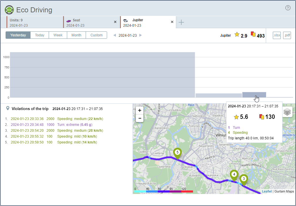 Trips are displayed as bars. The width of the bar is the ratio of the duration of the first trip to the time of all the trips in the indicated interval. The height of the bar shows the number of penalty points. The minimum and maximum penalty value on the indicated interval are viewed in the scale to the left. When you point to the trip bar, a tooltip with the following information appears: