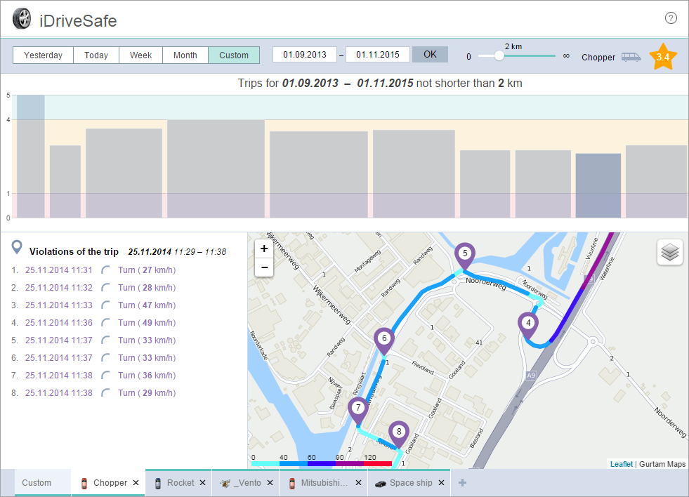 Trips are displayed as columns. The width of the column is the ratio of the duration of the first trip to the time of all the trips in the indicated interval. The height of the column is a driving quality score (with a scale from 0 to 5).