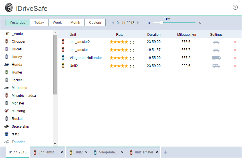 In the top bar, you should indicate the time interval for which you want to receive a driving quality assessment. There are two types of intervals available: established (Yesterday, Today, Week, Month) and adjustable (Custom) for which you can indicate any dates. By using the Previous/Next arrows you can change the established interval for a day, week or month.