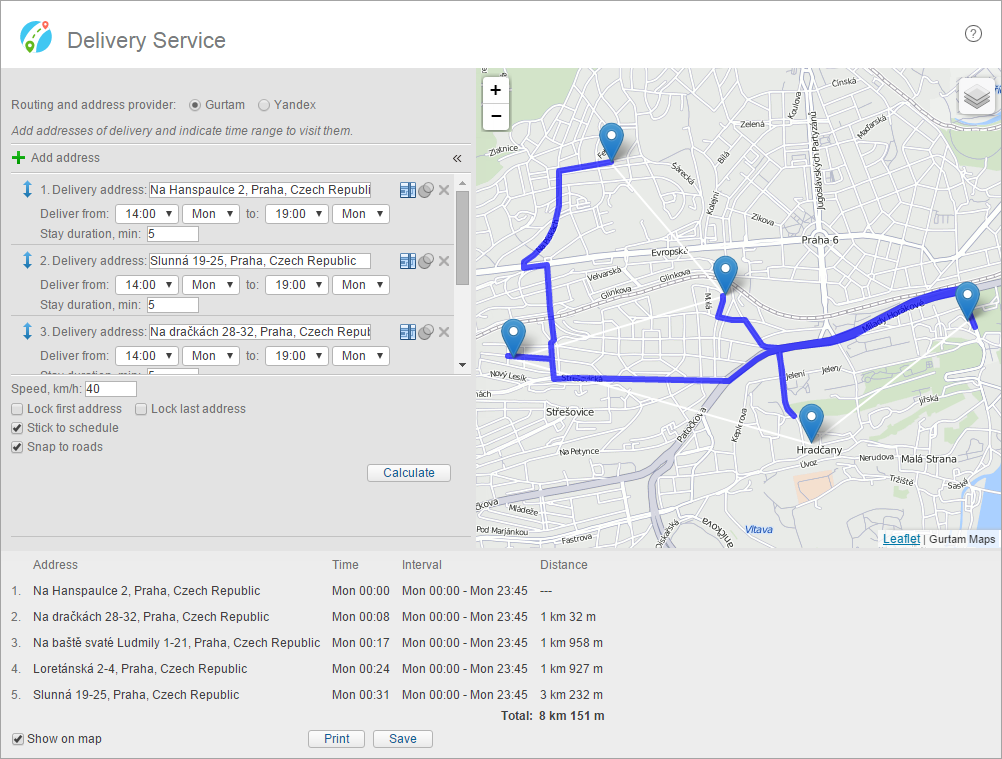 After the route has been calculated it is displayed on the map. The detailed information in the form of a table with order and visiting time of all the points as well as the distance between every point appears in the bottom bar. If you click on the address in the table, the map is centred on the corresponding check point.