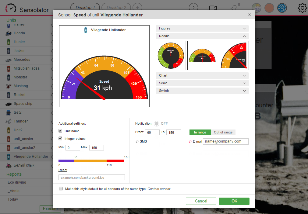 You can also set any background for a counter/sensor (any graphical format is available). To do this, enter the address of a picture in the corresponding field. This option is available for the Figures, Needle, Scale and Switch templates.