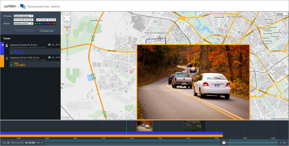 The upper part of the player control panel is the chronological scale corresponding to the indicated time interval. Trips on the scale are displayed by colour stripes. If you click on the Show/Hide photos button, smaller-sized photos sent by a unit are added to the scale. This button is available if the equipment supports the photo sending function and there are photos sent during the indicated interval. Point to a photo to enlarge it.