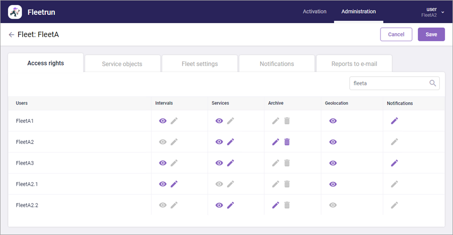 After the fleet has been activated, it becomes possible to grant access rights to it to other users. In order to grant any right to the fleet, activate it in the line next to the name of the required user and press Save. For a quick user search, there is the dynamic filter above the list.