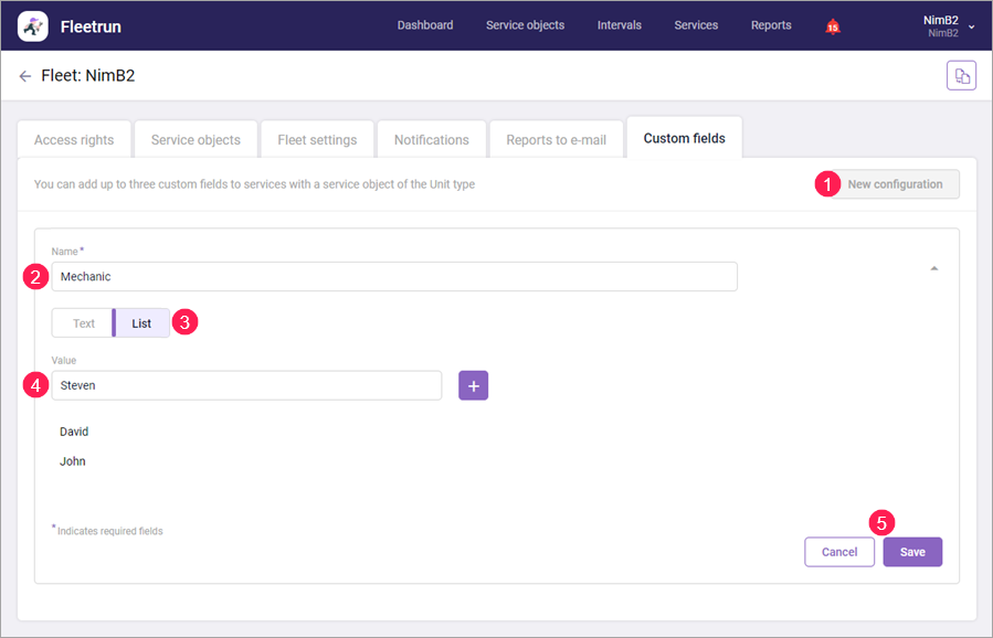 After saving the custom field, it is added to all the services of units. In the user interface, the custom fields are optional.