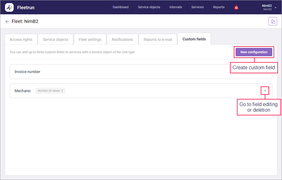 On this tab, you can create, edit and delete custom fields which should be displayed in the properties of the services with a service object of the Unit type. You can add up to three custom fields.