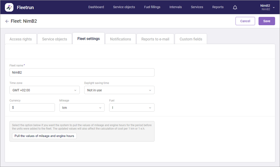 On this tab, you can specify the time zone, daylight saving time, units of mileage and fuel volume measurement, and the currency in use. Here you can also pull the values of mileage and engine hours for the period before the units were added to the fleet.