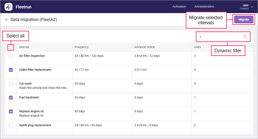 Data migration is available to the fleet administrator and is a process of importing maintenance intervals and services from Wialon to Fleetrun.
