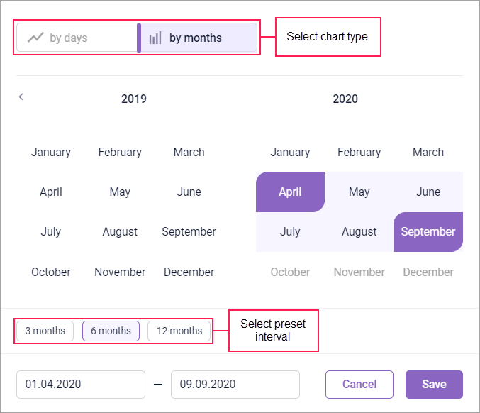 You can also select a preset interval: 3 months, 6 months, 12 months. After reloading the page, the 3 months interval is indicated in the calendar by default.