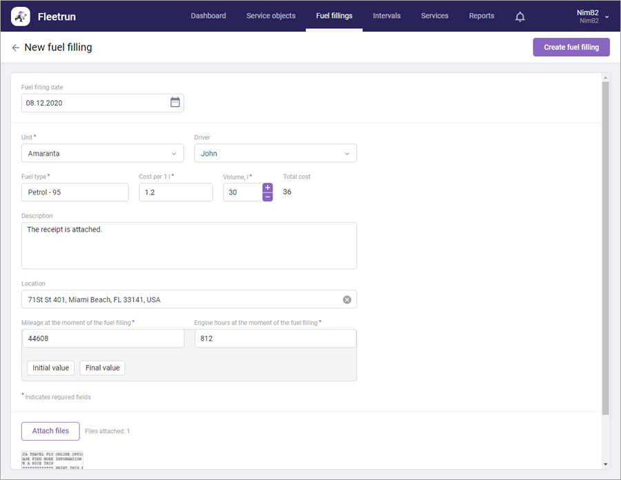 You can attach JPEG, PNG and PDF files to the fuel filling properties. Working with attachments in the fuel filling properties is similar to working with them in the service properties.