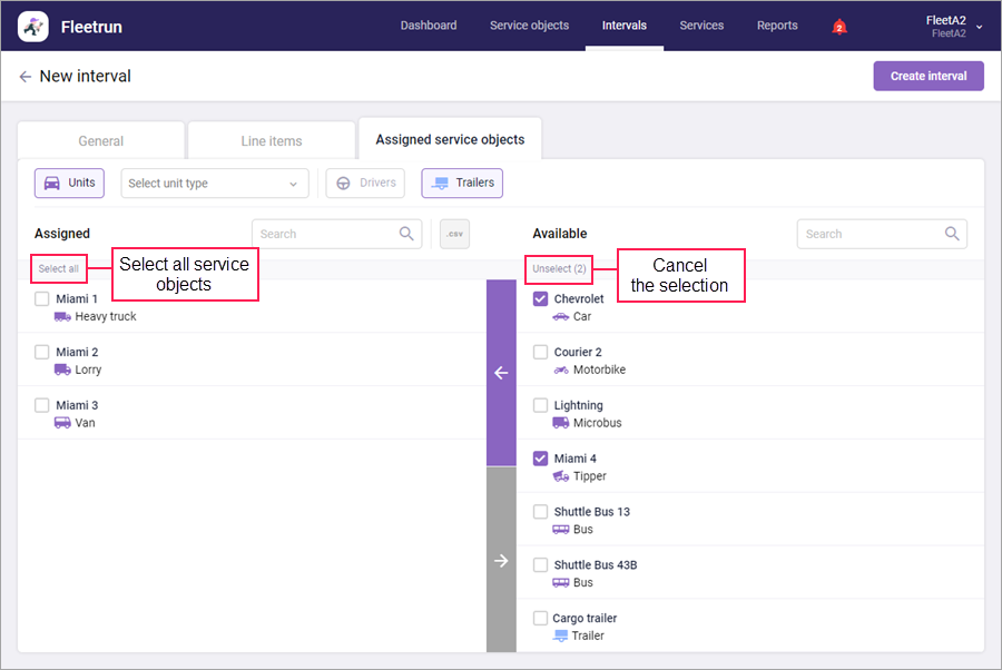 There are two lists on the Assigned service object tab: the left one displays the objects assigned to the interval, the right one shows all objects of the fleet.