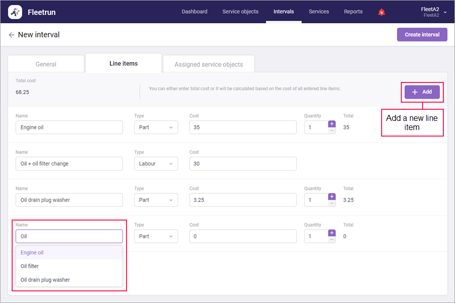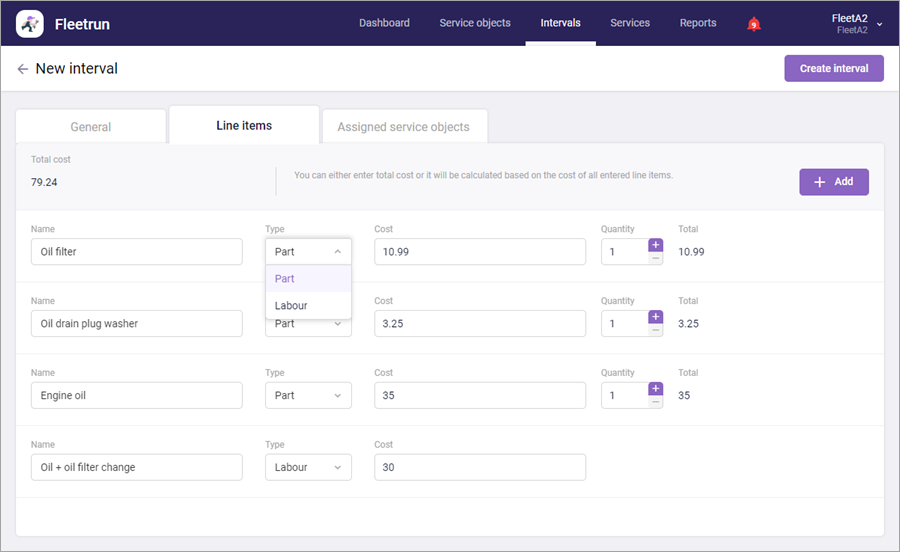 On the Line items tab, you can indicate the cost of spare parts and labour for the service interval.
