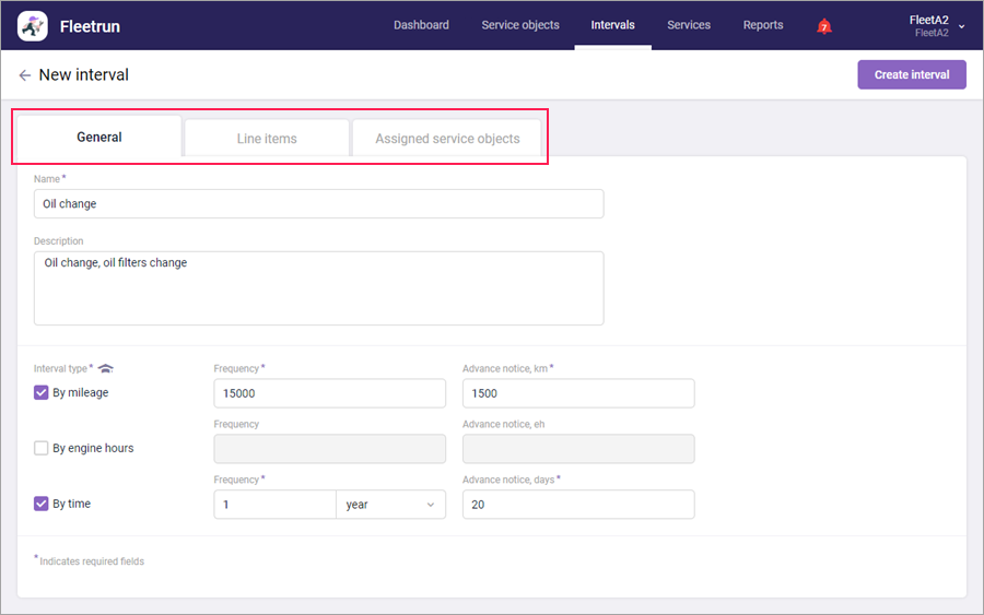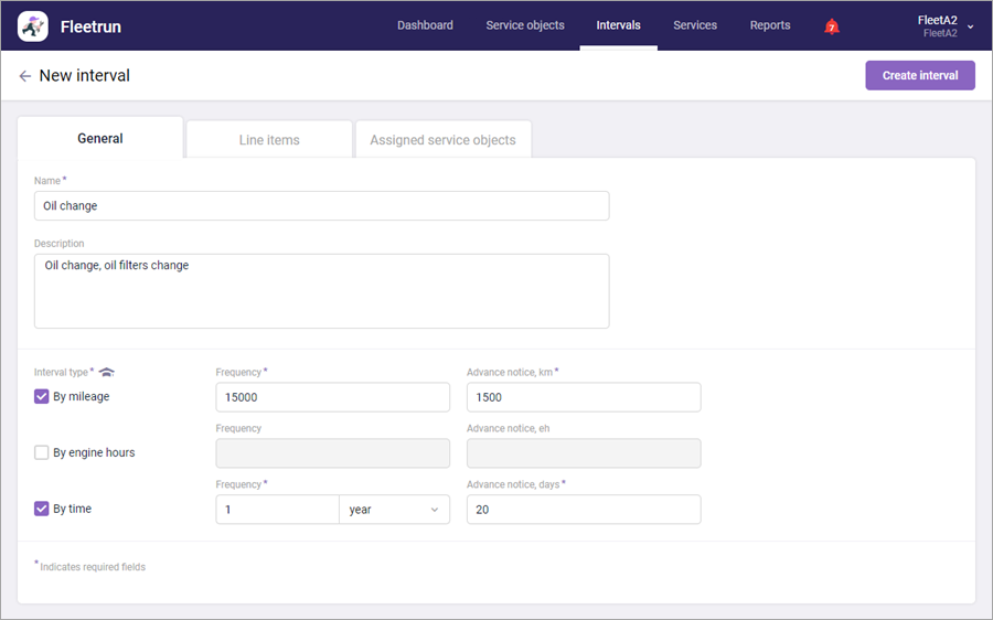 | Interval type* | The criterion that defines the frequency of service intervals. Three options are available: by mileage, by engine hours, by time. For each service interval, you can indicate several types. |
