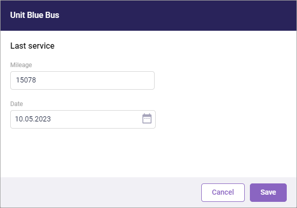 that appears at the end of the line with the interval when you pause on it. In the window that opens, for a unit, indicate mileage, engine hours and/or date at the time of the latest service interval; for trailers and drivers specify the date. Click Save.