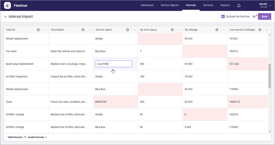 - In the Service object column, you can specify the names of only those units that are in the fleet (case sensitive). If several units of the fleet have the same name, all of them are assigned to the imported interval. The column shouldn’t contain driver or trailer names because the import of intervals is not available for them.