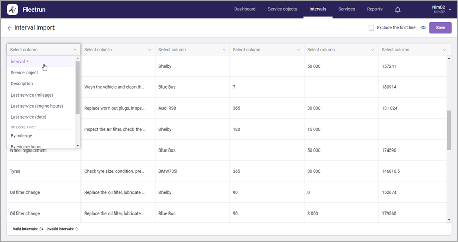 In the table with the import results, indicate the names of the necessary columns. To do this, select the name of each column in the drop-down list above it. The Interval column and at least one column from the Interval type block (By mileage, By engine hours, By time) are required. To cancel the selection, click on the icon