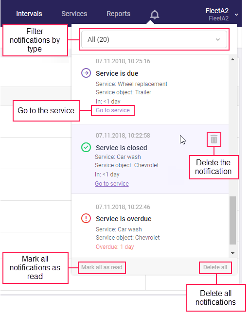 Unread notification has a light grey background, the read one — white. Click on the notification to mark it as read or use the Mark all as read at the bottom of the window for all unread notifications. Press Delete all to remove all the notifications from the list. To delete a particular notification, hover the mouse cursor over it and click the button