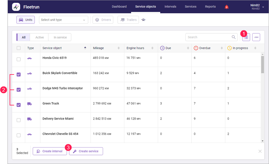 On the Service objects page, you can create intervals and services for several units, drivers, and/or trailers at once. To perform these operations, follow the steps below.