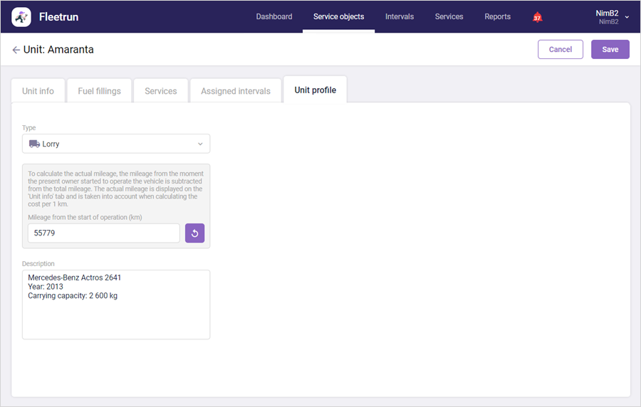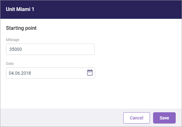 By default, the Mileage from the start of operation field displays the mileage value of the unit in kilometers or miles from the moment of adding it to Fleetrun. If there is mileage value pulled from Wialon, the field displays the sum of the mileage pulled from Wialon (before adding the unit to Fleetrun) and the mileage from Fleetrun. You can also specify a mileage value on your own. To do this, indicate the value in the field and click Save.