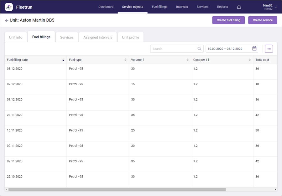 | Total cost of fuel | The total cost of fuel from the unit fuel fillings. |
