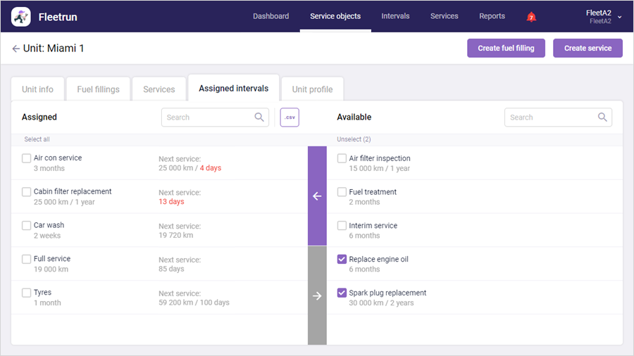 There are two lists on the Assigned intervals tab: the left one displays the intervals assigned to the service object, the right one — all the intervals created for the fleet.