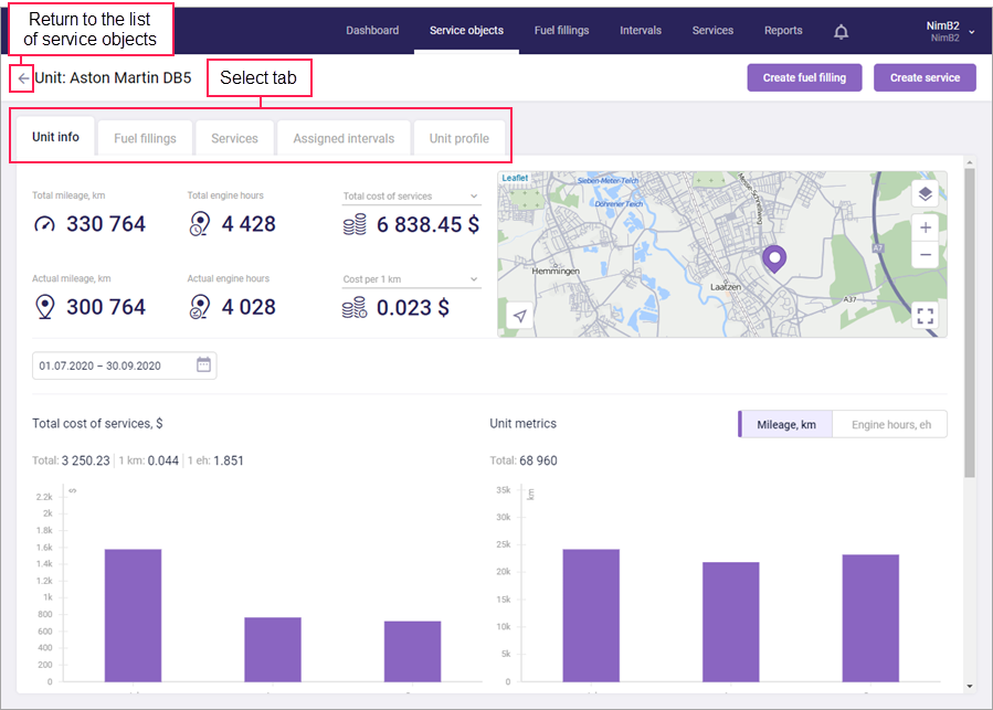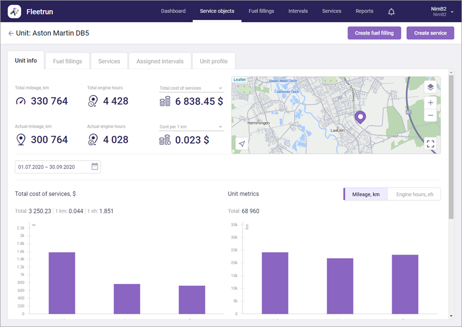 In the upper right corner, there is the Create service button which allows you to create a service. In the same corner of the unit properties, there is also the Create fuel filling button, a click on which opens the dialog box of creating a fuel filling.