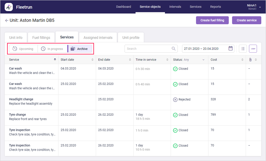 Depending on the position of the switch in the upper part of the tab, the table displays the upcoming, archived (completed) services or the ones in progress.