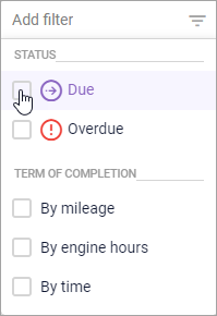 In the Add filter drop-down list, you can select the options of the service filtration by status and/or term of completion. The By mileage and By engine hours options are available only for services created automatically. If a service is created on the basis of an interval with several types, this service is shown in the table when you select any of the options corresponding to its types. If you select several options corresponding to its types, the service position in the table depends on the type which comes sooner.