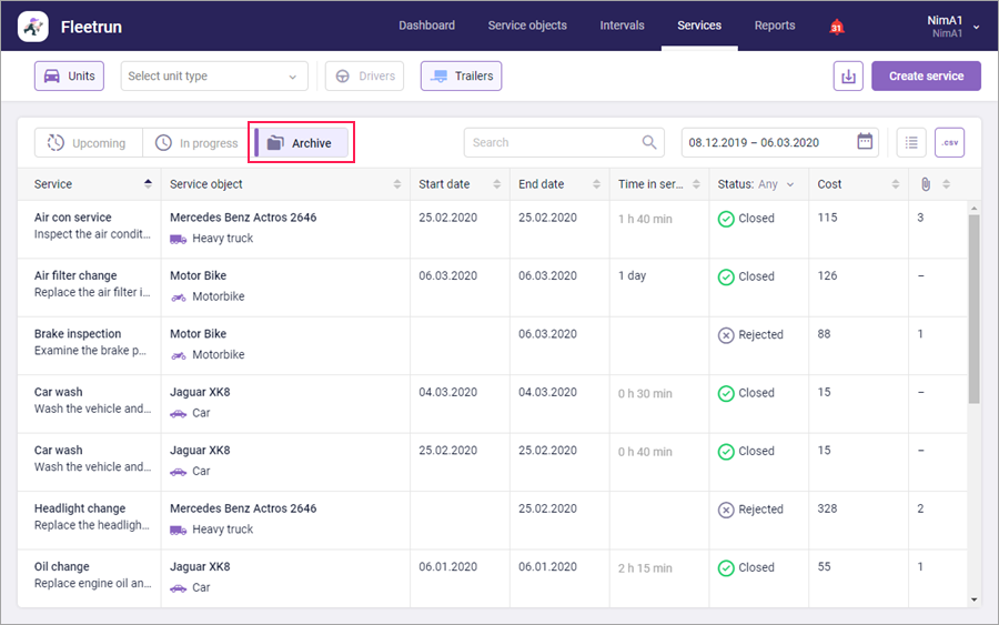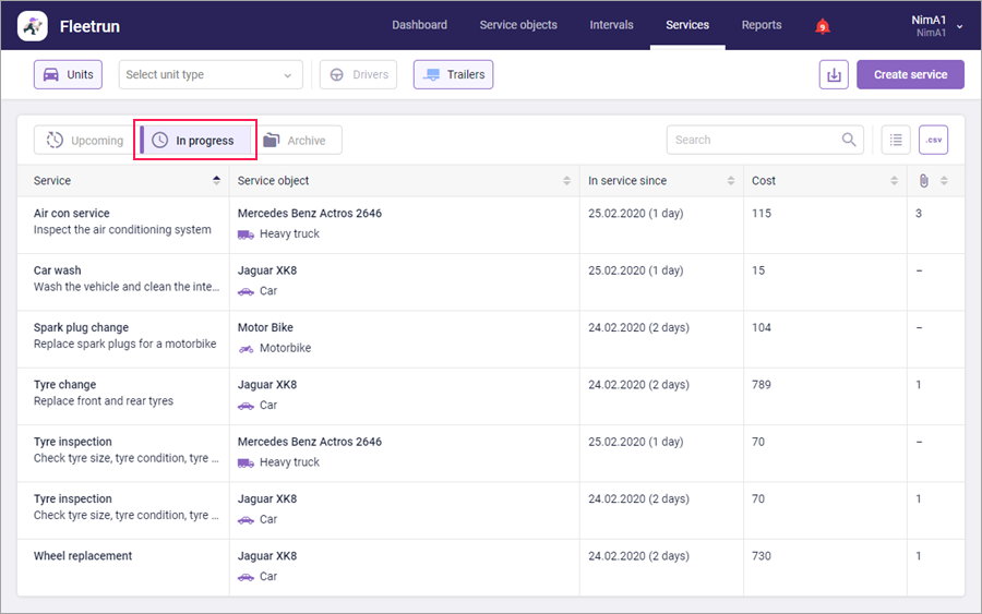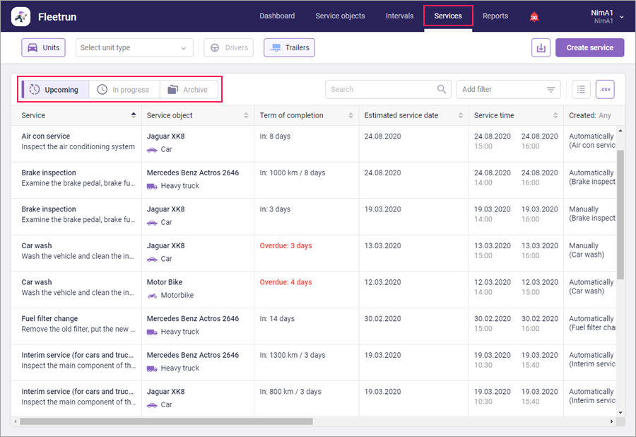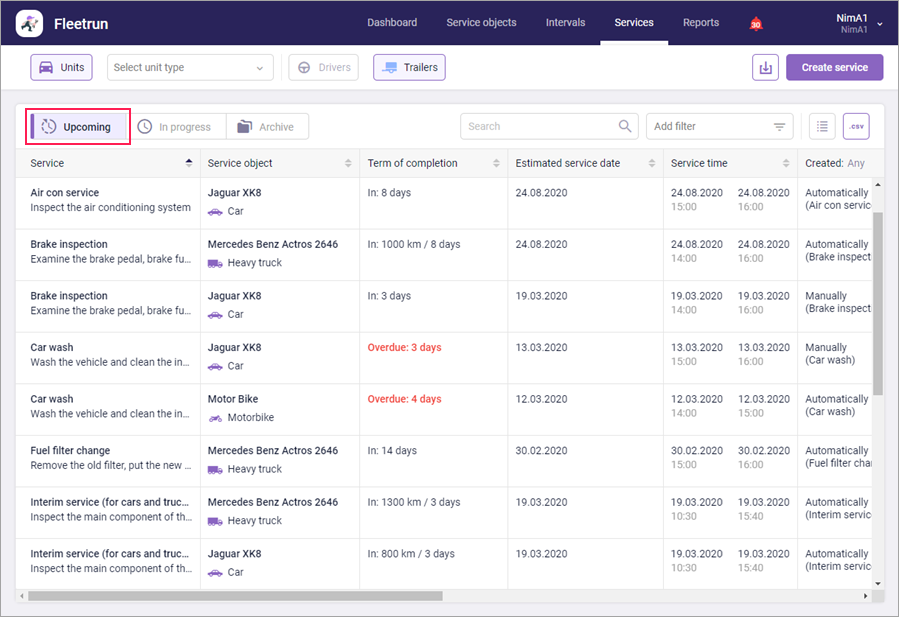 Service is work related to vehicle maintenance or validity control of the driver’s permits and documents. Services can be created manually or automatically (based on the service intervals).