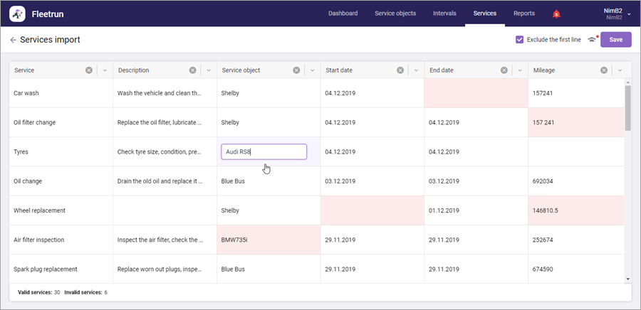 Edit the data in the table, if needed. The cells with invalid data are highlighted in red. The services with such cells cannot be imported. To edit the data, click on the cell and type a new text into it. To save the text, click outside the cell.