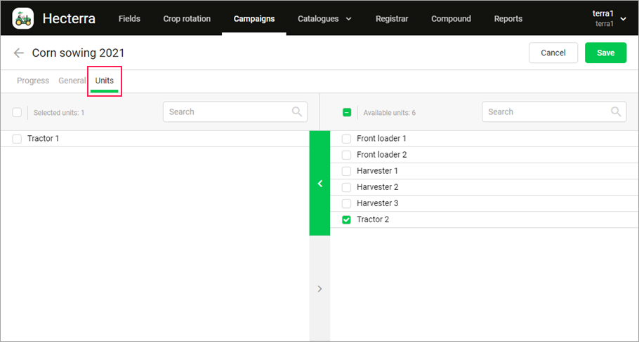 On this tab, you can select units which should be used to carry out the campaign. This is an optional action, but it allows you to find potential cultivations by campaigns on the Registrar page.