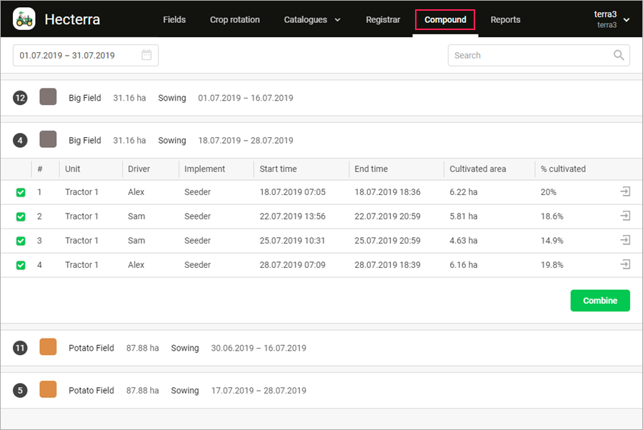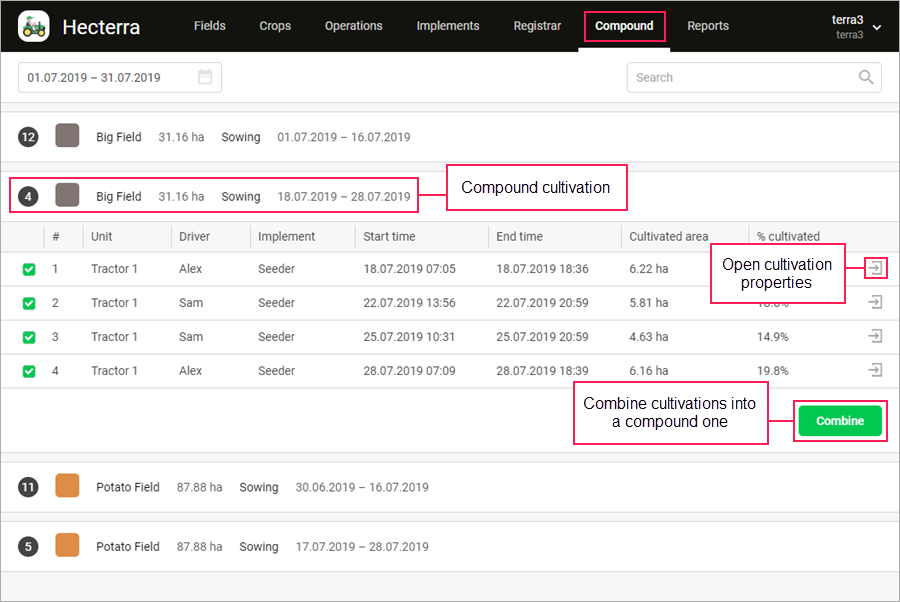 Compound cultivation is a collection of cultivations carried out in the same field. It is convenient to use a compound cultivation, for example, when one field is cultivated by several units at the same time or by one unit for several days, but it should be displayed as one cultivation in the report.