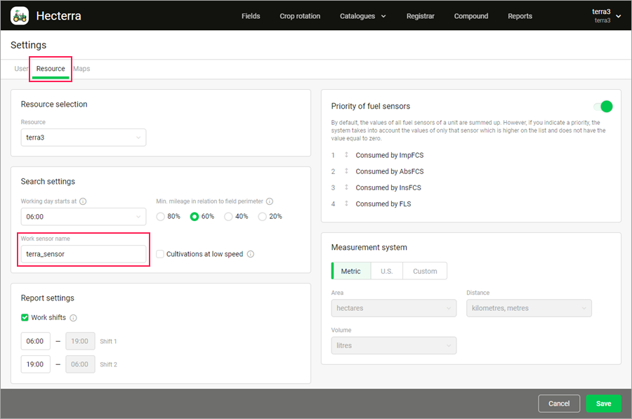 Select Settings in the user menu in Hecterra. In the Work sensor name field on the Resource tab, specify the name of the sensor configured in Wialon. Click Save.