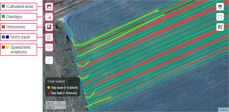The Speed limit violations layer becomes available if an operation is specified in the cultivation properties and this operation has a speed range configured. In this case, the segments of the track with the speed lower or higher than permitted are coloured in yellow or red respectively.