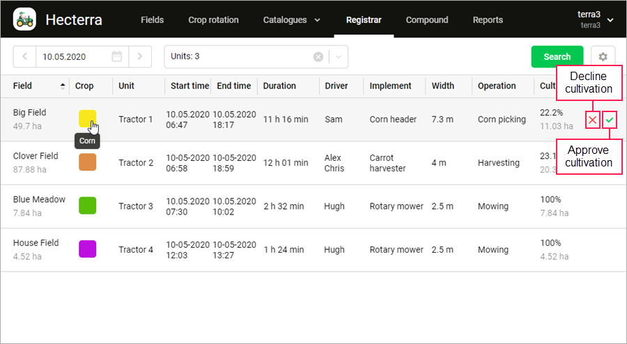 From the table, you can also approve or decline cultivation. To do this, point to the cultivation line and select the required action.