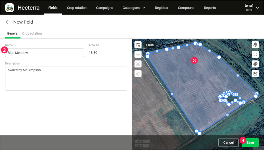 (Draw field) and indicate the field borders on the map. After that, the field area in hectares is displayed to the right of its name. - Click on the Save button to confirm the changes.