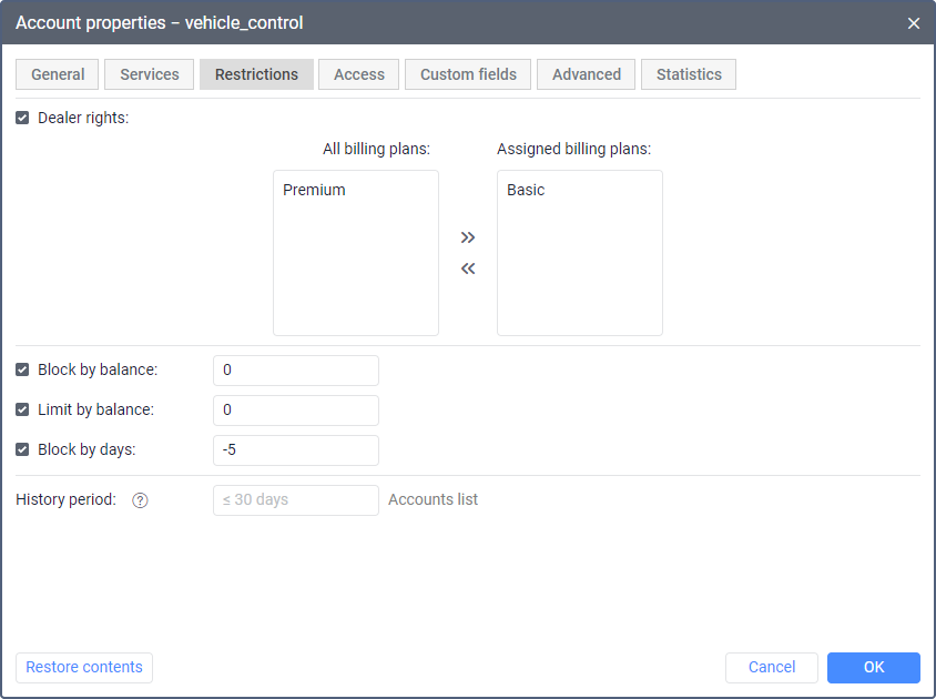 By default, the history period is taken from the billing plan settings. If the history period specified in the account settings exceeds the one in the billing plan settings, the latter is applied. If the history period specified in the account settings is less than that of the billing plan, the former is applied. To reset the default value, enter 0.