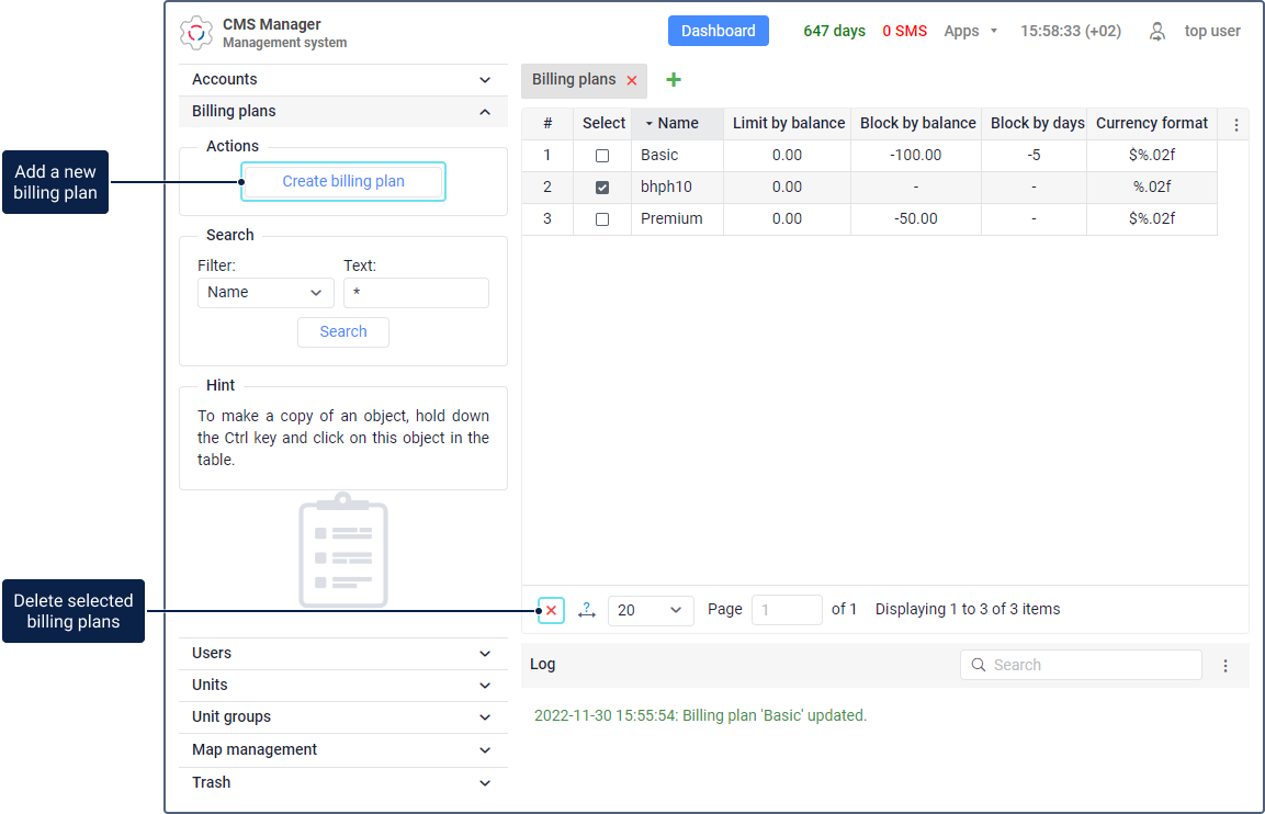 To create a copy of the billing plan, click on its line in the table while holding down Ctrl. To delete a billing plan, select it and click on the icon