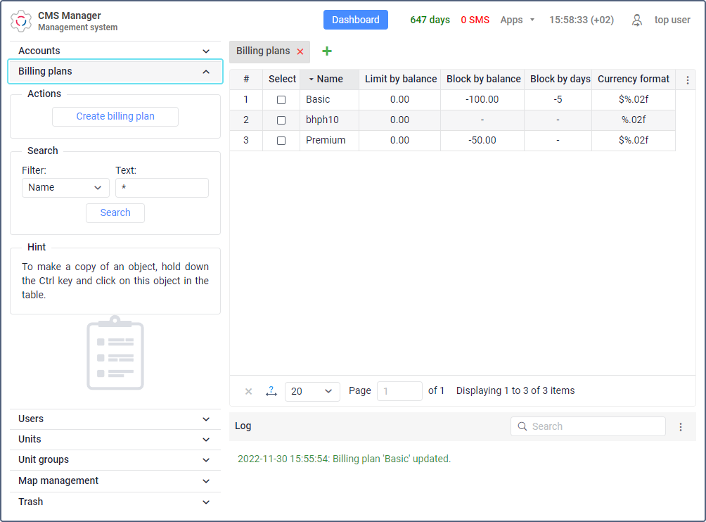 To work with billing plans, go to the Billing plans section in the navigation panel of CMS Manager. Here you can create, edit, and delete billing plans as well as search for them by name.