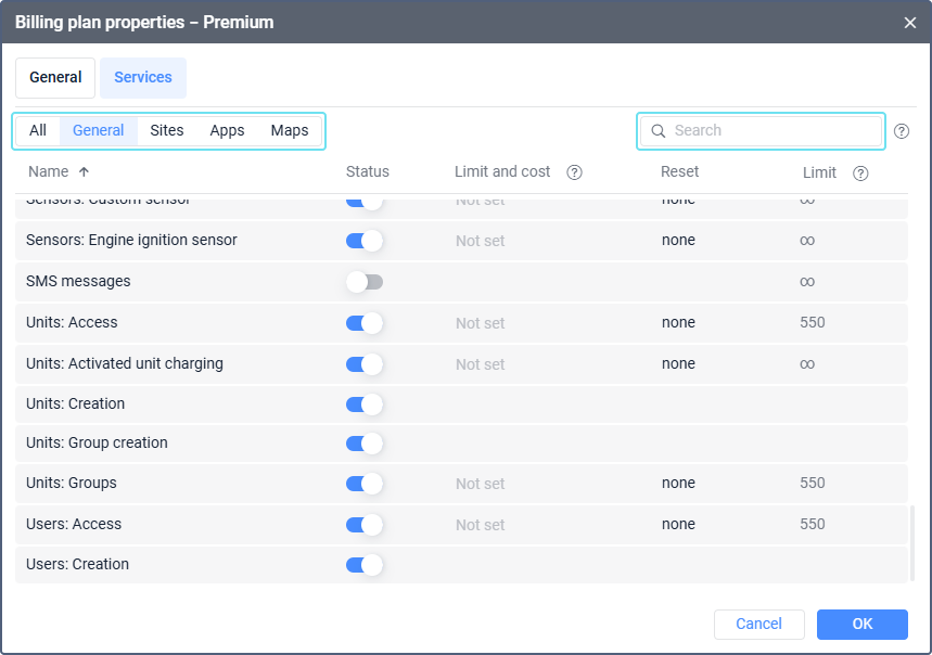 The group includes general LeaseControl functionality, such as Units, Commands, Geofences and others. Here you can enable or disable the service, configure the Limit and cost setting and select the reset period.