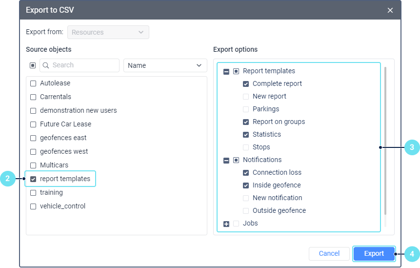 ) and select the required ones. If you mark several resources, all the objects of the selected type are exported. - Click on the Export button.