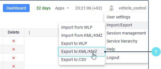 In the user menu, select the Import/Export item and click Export to KML/KMZ.