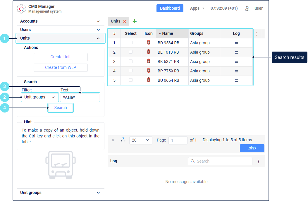 | Units | Activated | Searching among the activated units (by name). Leave the Text field empty to see all the activated units. |