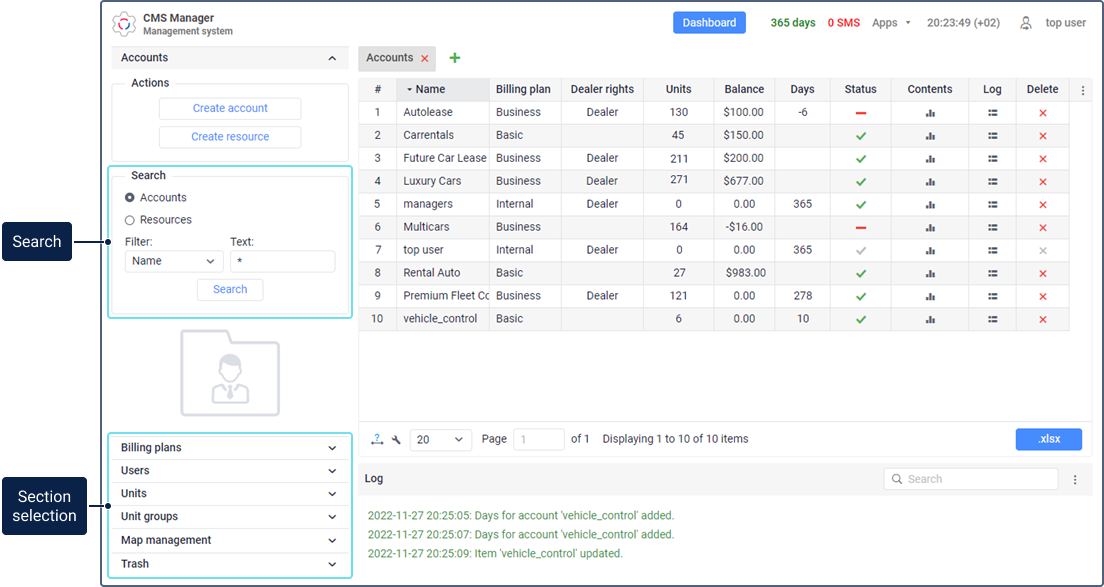 | Actions | In this section, you can see a button (buttons) for creating system objects (accounts, users, units, etc.). |