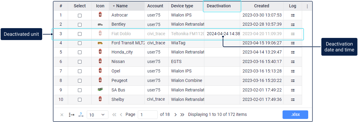 The lines with deactivated units are highlighted in light grey in the table. The date and time of deactivation are displayed in the Deactivation column.