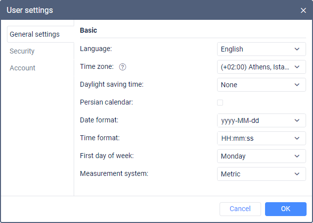 To view or change the settings of the current user-manager, select User settings in the user menu.